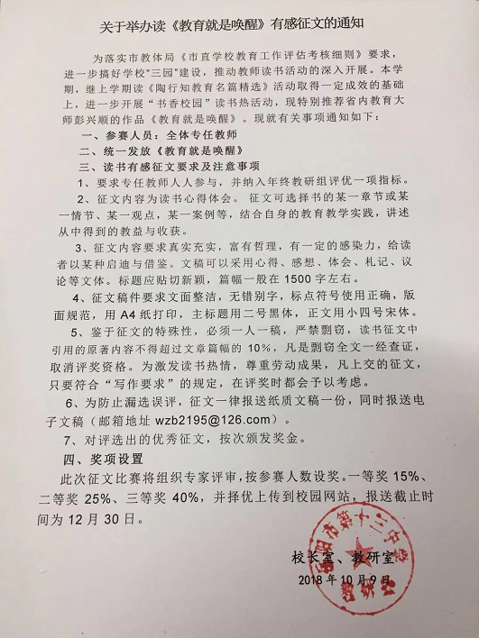 “书香校园”读书活动常态化,上学期读完《陶行知名篇精选》并在暑期教师学习班上有代表作了典型发言,下学期又统一分发名家作品《教育就是唤醒》,并且参加读书有奖征文竞赛活动。